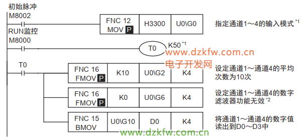 3、A/D轉換值保存在4AD的緩沖存儲區(BFM)中。